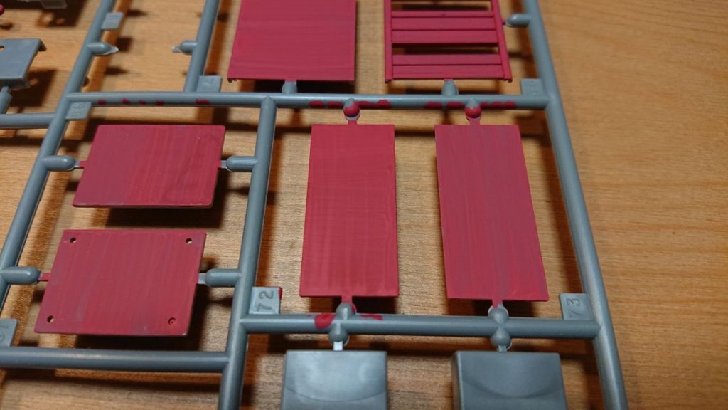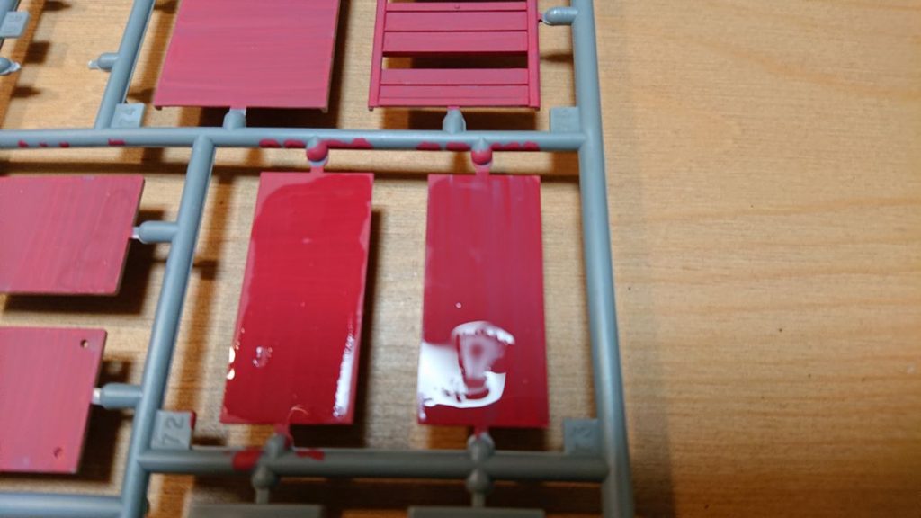 そうだな、実際に使ってみるとその辺は強く感じる。アクリジョンを使っていたときが嘘のように色がついていく。例えば、やや濃い目の成型色にベースカラーの赤を2度塗りしただけでこんな感じになる。