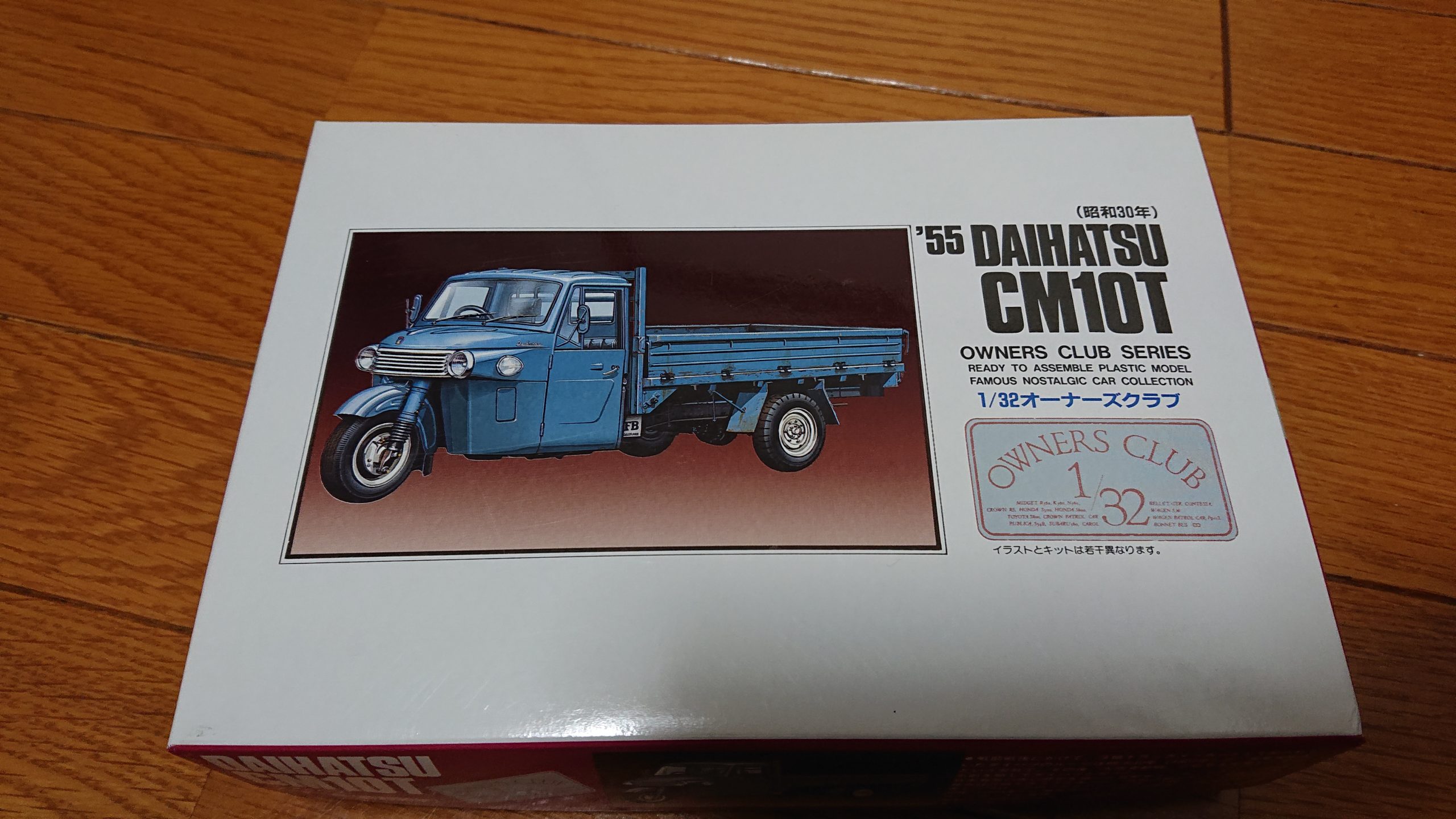 私がよく行く模型屋の棚に、マイクロエース社の1/32オーナーズクラブという車のシリーズが置いてある。箱は新しいが割と昔から見かけたような感じの箱で、箱の横にはマイクロエースではなくアリイのロゴが描かれている。この箱絵がなんとも粋な雰囲気でありながらも側面のデザインがえらく昔っぽくて、比較的低価格(というより、最近の1/32の車のキットの価格が高い)だったこともあり、思わず買ってしまった。ちなみに、この店では、中身を見て確認することはできず、たまに中のパーツ見たさにプラモを買ってしまうこともある。