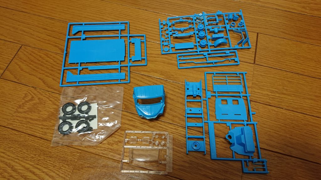 キットのパーツはあっさりしたもので、しかもシャーシとキャビン、シャーシと荷台がネジ止め。これはえらく古い設計のキットを買ってしまったものだが、逆に子供の頃に作ったプラモデルを思い出しながら作るのも悪くないと思い直した。私の記憶だと、1980年代以降に発売された車のプラモデルで主要部品をネジ止めする設計のものはモーターライズ化されたものを除けば皆無だった、いや、1970年代のスーパーカーブームの頃に発売されたキットでもこういう設計はなかったと思う。トラックのようなラダーブレーム構造の車のプラモデルならあったんだろうか?