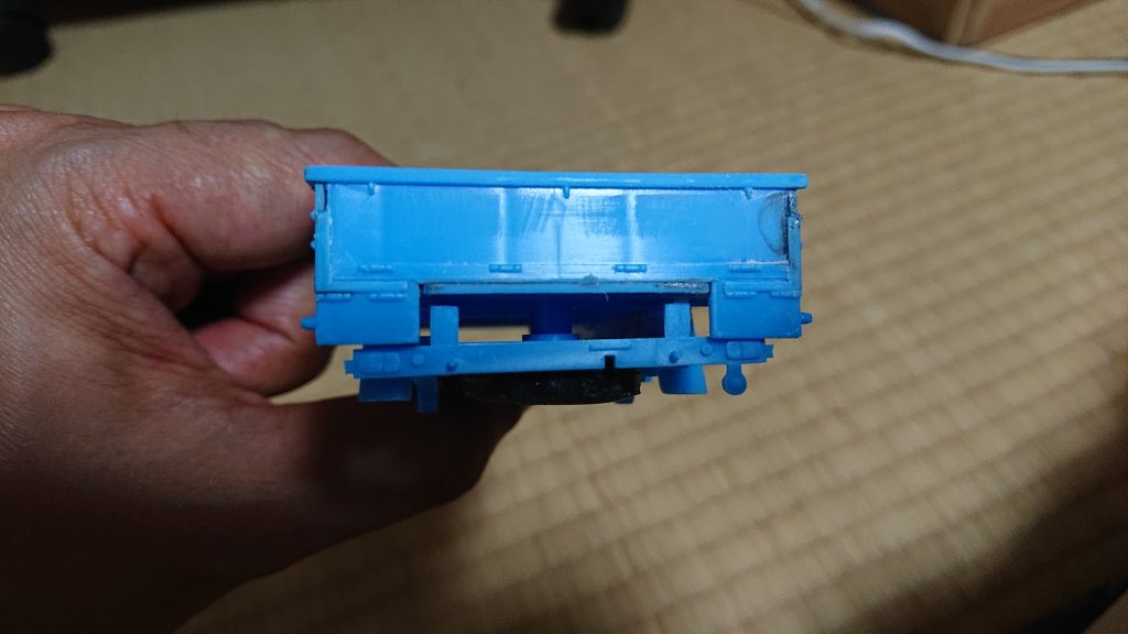 上の写真のように、荷台とシャーシの間に円柱形の柱がある。これがネジの受けとなる部分。ここだけはかなり目立つので切り落とす。