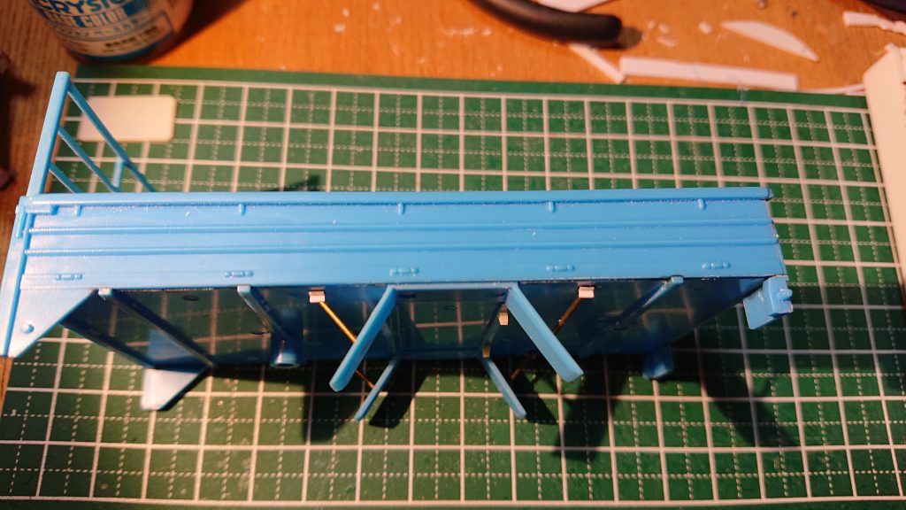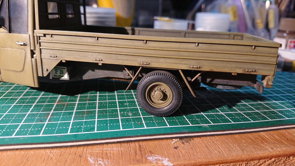 荷台の泥除けのサポートには0.8mmの真鍮線を使い、荷台側はL字の棒、泥除け側には取り付け用のブラケットをそれらしくあしらっている。実物の写真ではよくわからなかったので「多分こんな感じになってるはず」という形にした。泥除けは流石に分厚いので端部だけを薄く削った。
