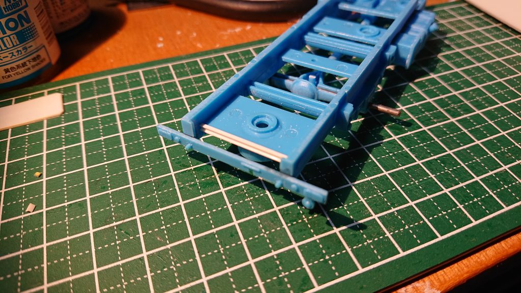 ネジの受けを切り落としたところで、ラダーフレームの後方にこんな板状の部分はない。しかし、その端面にコの字型の棒材を貼ってやると荷代を取り付けたときにそれっぽくなる。なあに、どうせそんなに見える部分じゃないのでこのくらいで問題なし。