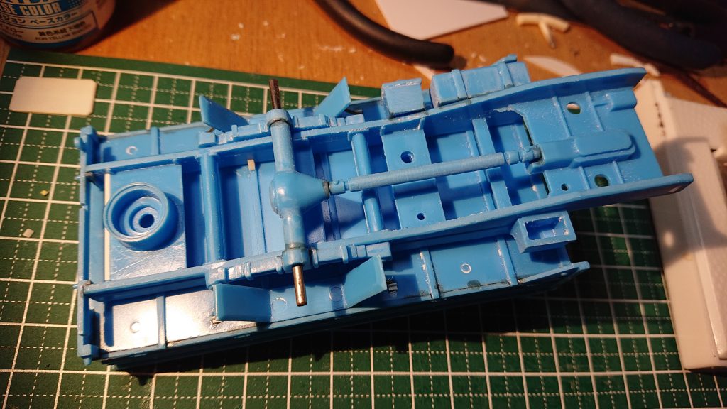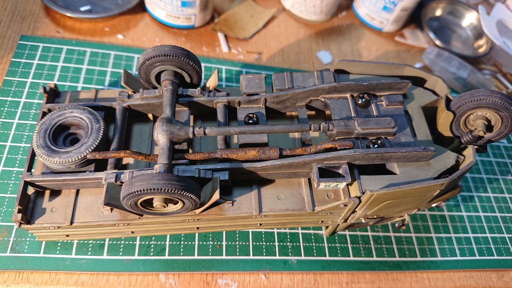 シャーシを裏側から見るとこんな感じ。ラダーフレームの中央にドライブシャフトが走り、デフケースが見えるってくらいのざっくりとした表現。ラダーフレームはかなりいい加減で、後方(写真左側)には板状のビームにカップ状の膨らみがあるが、これがスペアタイヤのホイールという作り。流石にここに手を入れて作り直すのはかなり骨が折れる上に見た目の効果も薄いので、先に述べたように端面にコの字型のプラ棒を貼り付けてそれっぽく見せるにとどめた。