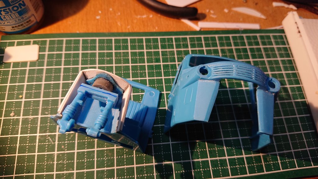 正面のグリルはちゃんとスリット状に穴を開けて内部が見えるようにした。こういう本来空間である部分を再現すると模型としての見栄えがぐっと上がるが、そのままだとキャビンの中まで見えてしまうので、プラ板にてインナーフェンダーを作る。また、ステアリングフォークが後ハメできるように手持ちのポリキャップ部品(コトブキヤかWAVEだったか)を使ってみた。また、ステアリングフォークも、グリルの穴あけで丸見えになるので、実物っぽい形状に削った。写真はノーマル部品に削る部分のアタリをつけるために青ペンで線を書き込んだもの。