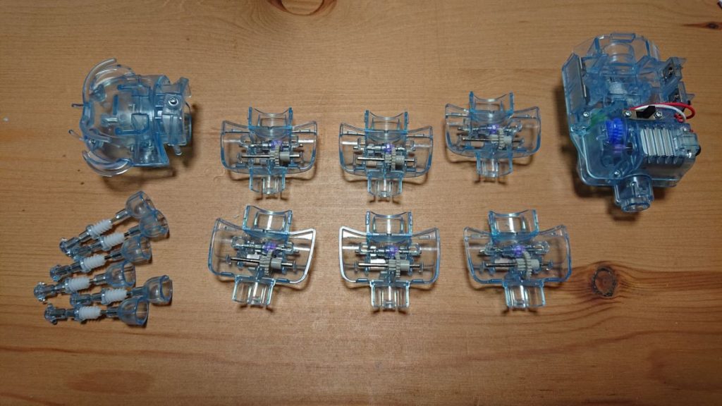 駆動ユニットは過負荷防止のクラッチ機構などが実装されており中々凝った作りである。モータを進行方向に対して横に置き、ウォームを使って進行方向軸の回転に一度変え、更に進行方向とは直角に配置されている脚ドライブシャフトへはウォームギヤを使って動力を伝達している。駆動ユニットの動力は、進行方向軸からカップリングを介して他のユニットに伝達されるというもので、このカップリングのおかげで各ユニットは簡単に抜き差しができるようになっている。