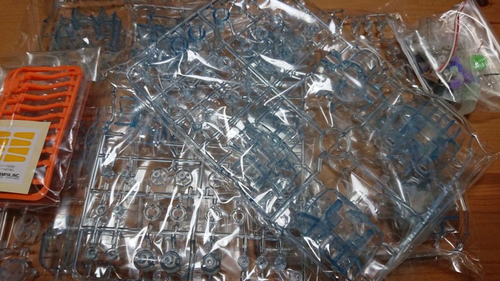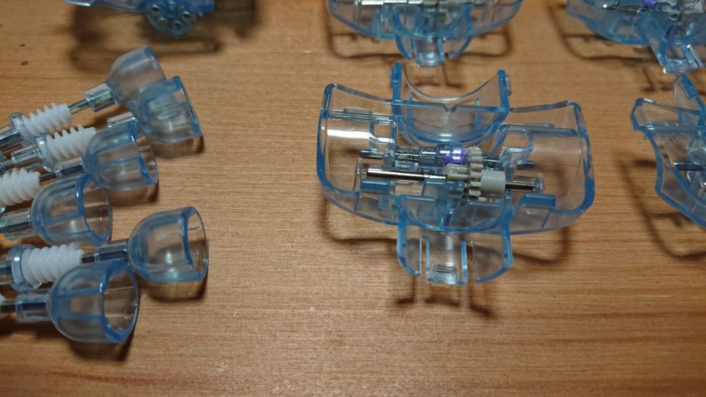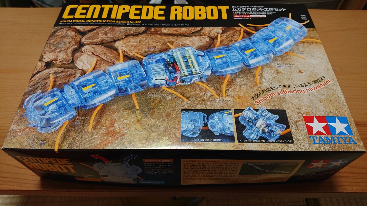 タミヤの工作セットといえば、朴の木のベースにギヤボックスを木ネジでとりつけて組み立てるものだったんだよ、って思っている昭和世代としては一抹の寂しさを感じながらも、木製のベースに部品を固定するスタイルだとこのムカデの実現は難しいのでこれは仕方ないところ。それに、プラモデル形式は工作の難易度が圧倒的に低いので、これはこれで良いのだろう。