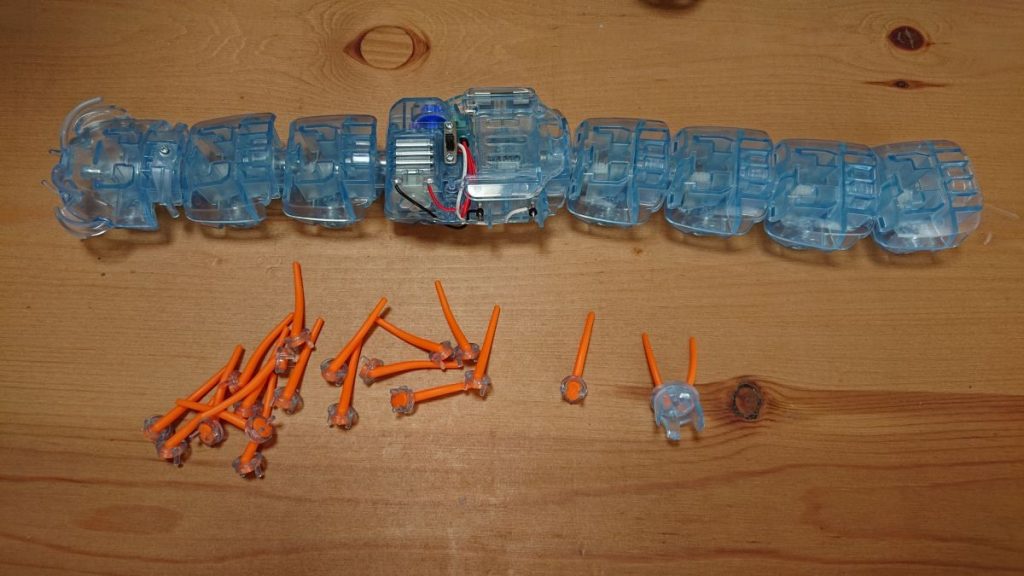 実際に動かしてみると、各ユニット間の連結部はフリーに動くだけなのに、何となく左右に蛇行するし、本物のムカデが歩いているように見える。障害物に対して正面からぶつからない限り何となく回避できているし、本当に前方をセンシングして進行方向を変えているように見えなくもない。