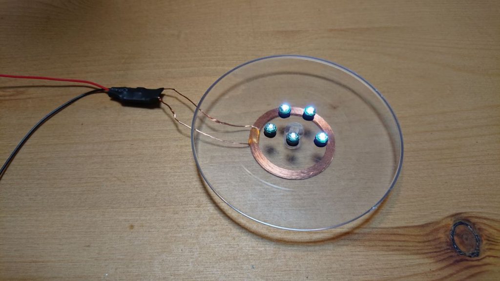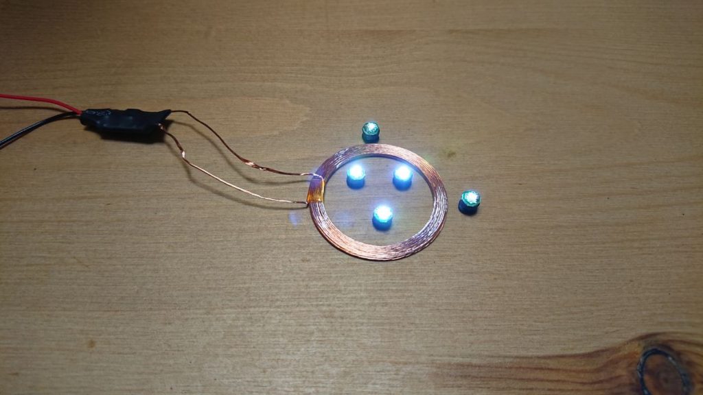 給電コイルの内側にワイヤレスLEDを置くと光る、どうやら必ずしも給電コイルの内側でなくともよいのだが、やはりコイルの外側だと磁場強度が弱くLEDもやや暗い。