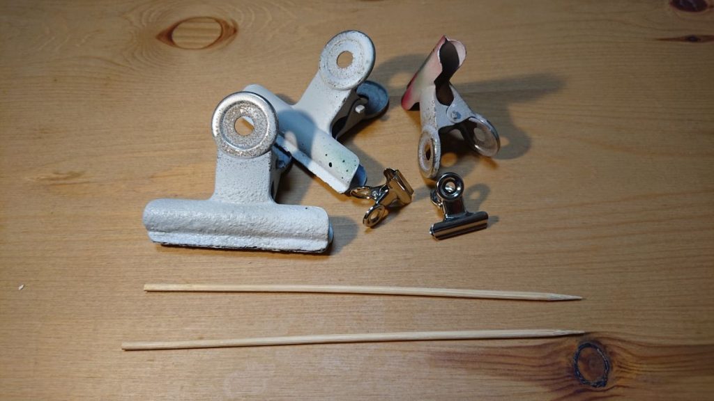 塗装した部品を乾燥させるための台として、クリップなどをいくつか持っておくと便利です。部品に穴が空いている場合は竹串の先端に刺したものをクリップなどで掴んで置くといった使い方もできます。写真にはありませんが、マスキングテープなども用意しておくと良いでしょう。