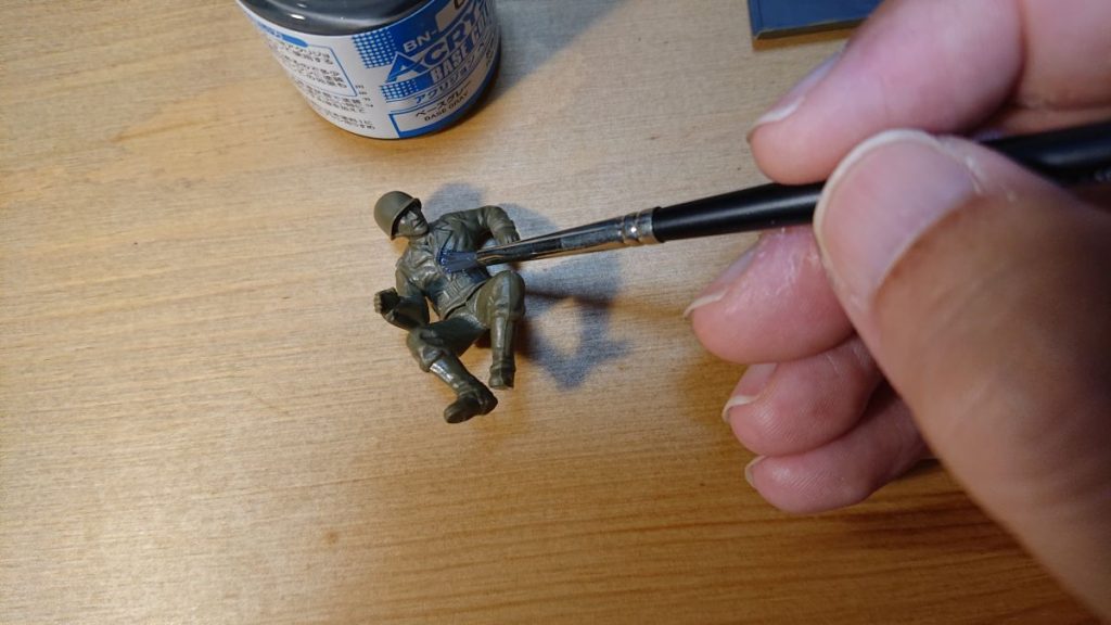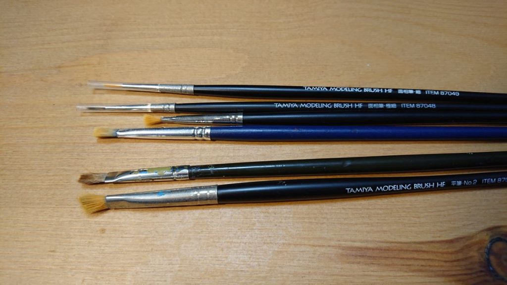 筆はとりあえずタミヤのナイロンの毛のものを使っています。今回は、タミヤモデリングブラシHFの面相筆(細)と平筆No.0を主に使用、細かいところは面相筆(極細)を使いました。