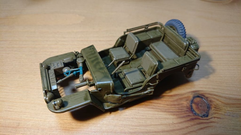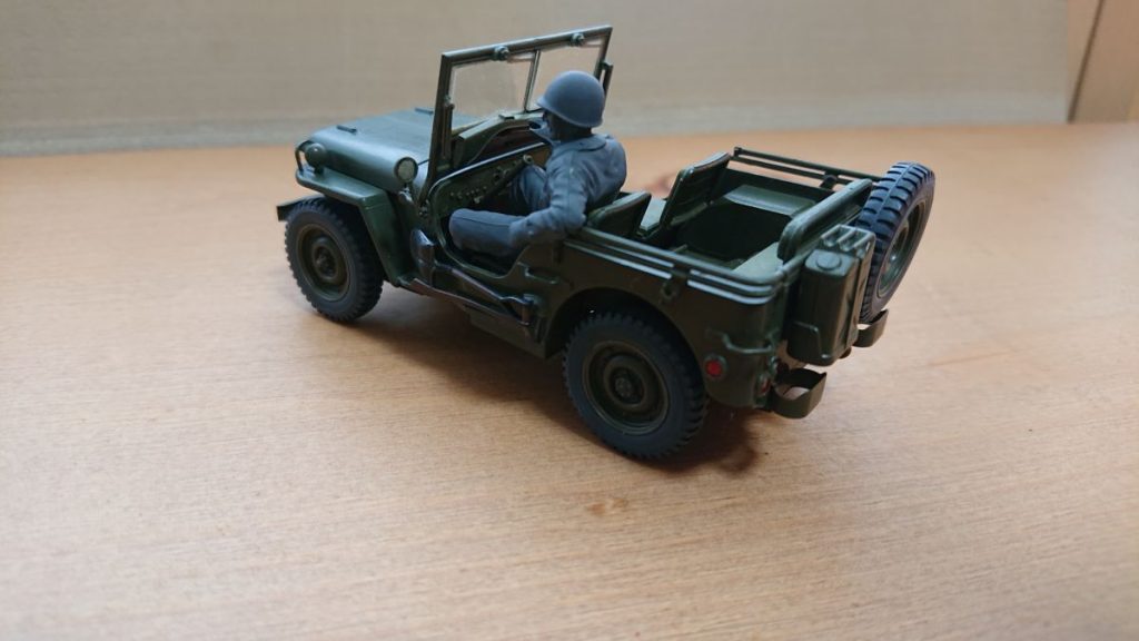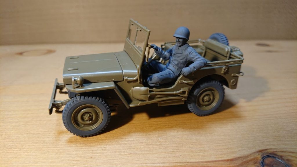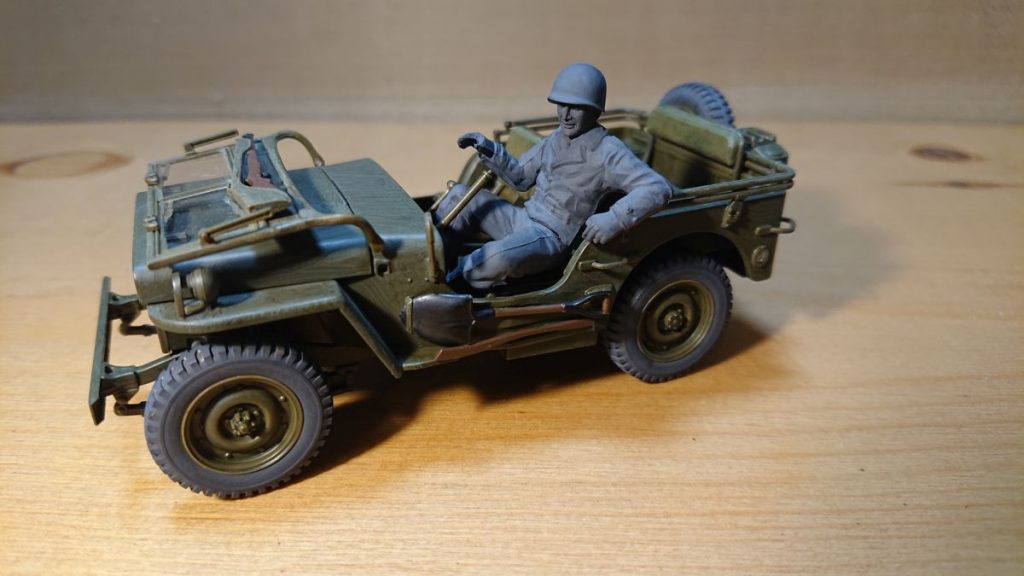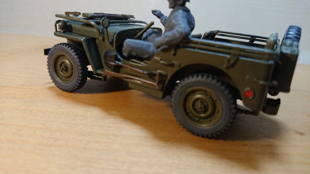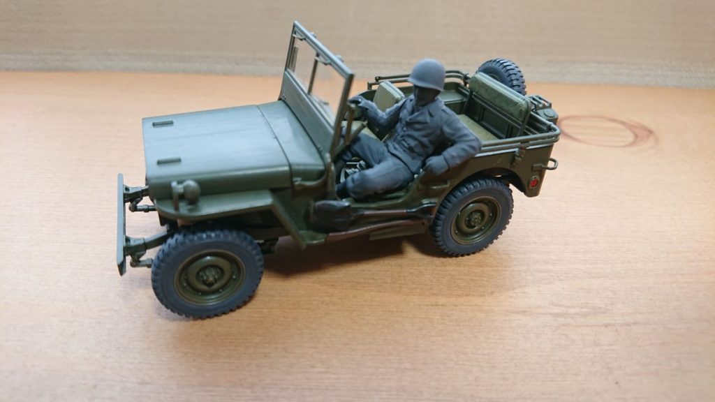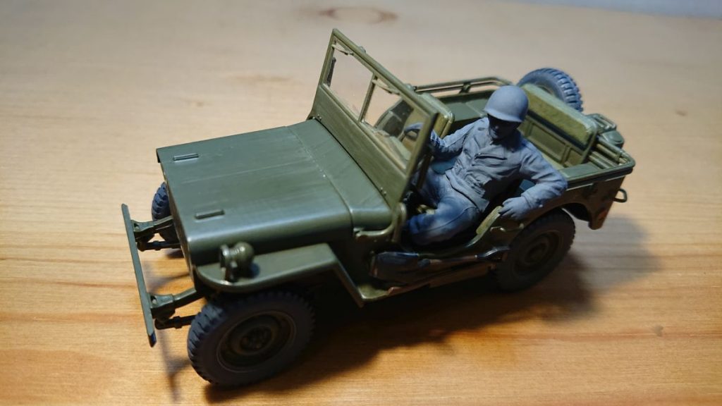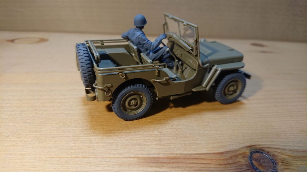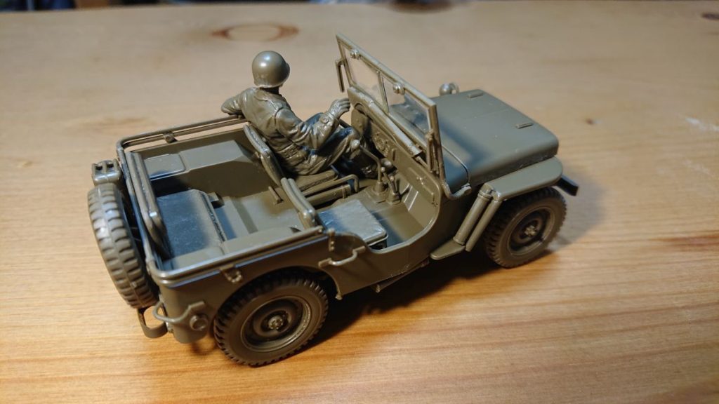 これでジープは完成です。ドライバーの色がグレーのままで、これはこれでいいのかなと思いつつ、フィギュアを後で外せるようハンドルはつけていないままです。