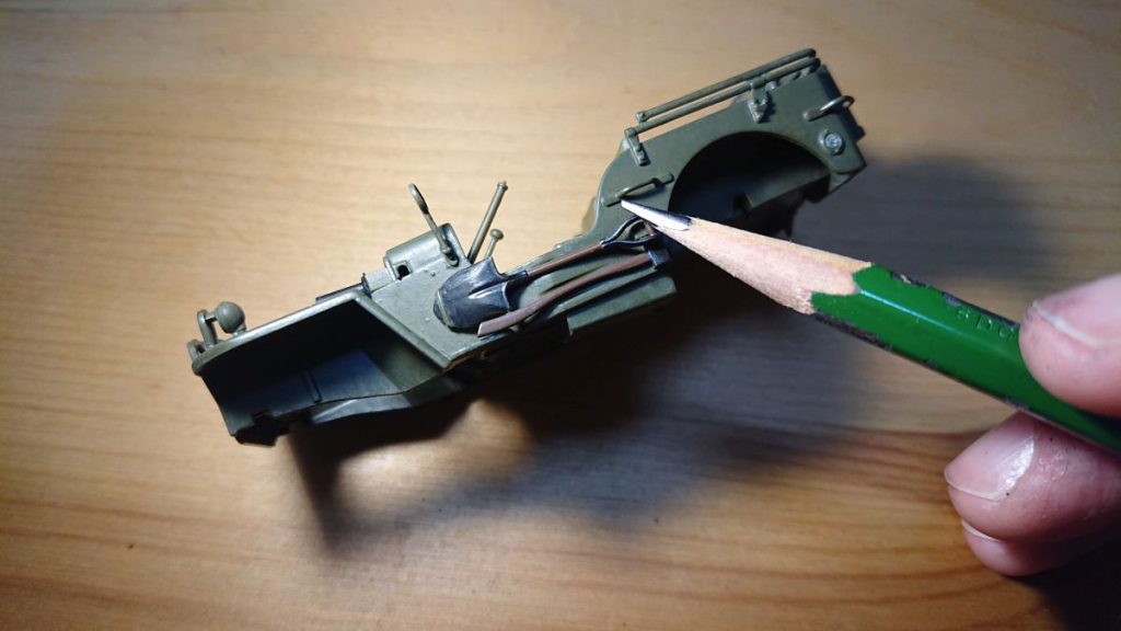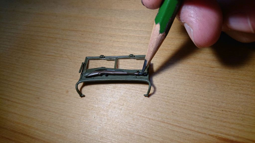 説明書の指定通りに塗らない部分その2。銃はガンメタル、スコップや斧の金属部分はメタリックグレイが指定されていますが、どちらもつや消し黒を薄めて塗ります。その後、鉛筆の芯をこすりつけて金属っぽさを出します。