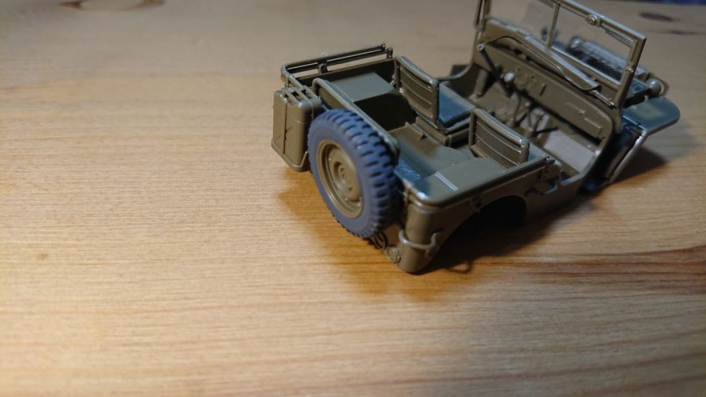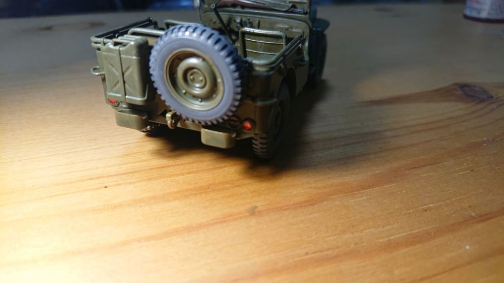 リアのスペアタイヤもベースグレーで塗装します。説明書の指定ではつや消しブラックなのですが、黒に近いグレーで塗ったほうがタイヤのゴムらしさが表現できます。流石にベースグレー単体だと若干苦しいのですが、タイヤらしく見えてきました。