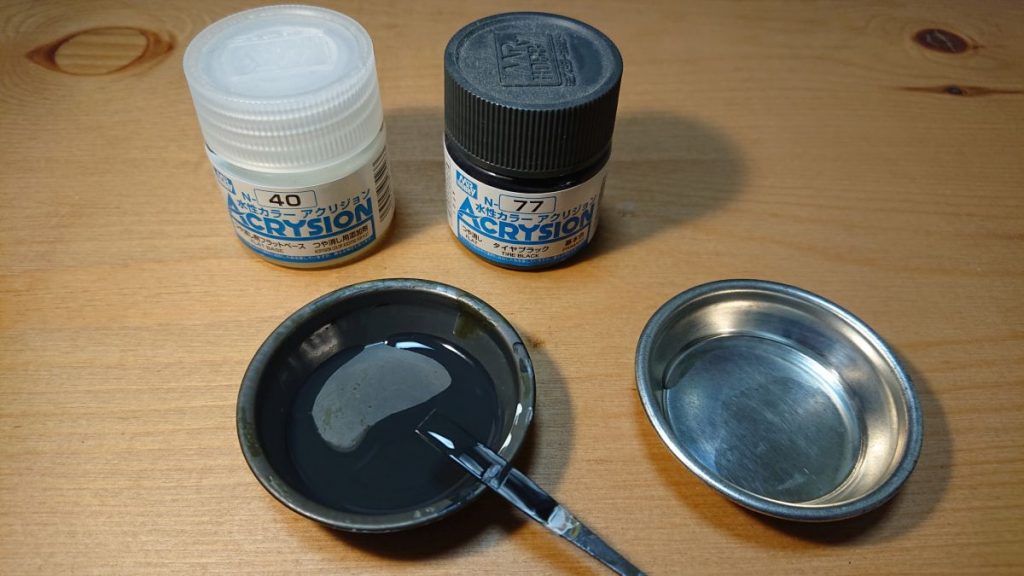 指定通りでない塗装部分その3。タイヤはベースグレイのままでしたが、ここで塗装します。そのまま塗装するのではなく、まず、タイヤブラックにフラットベースを混ぜて薄め液と水でシャバシャバに薄めてから水性アクリル溶剤を一滴加えたものと、薄め液と水を1:1くらいで混ぜたものを用意します。