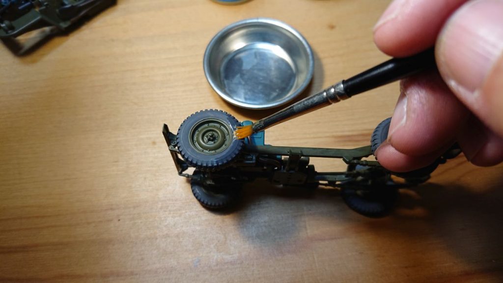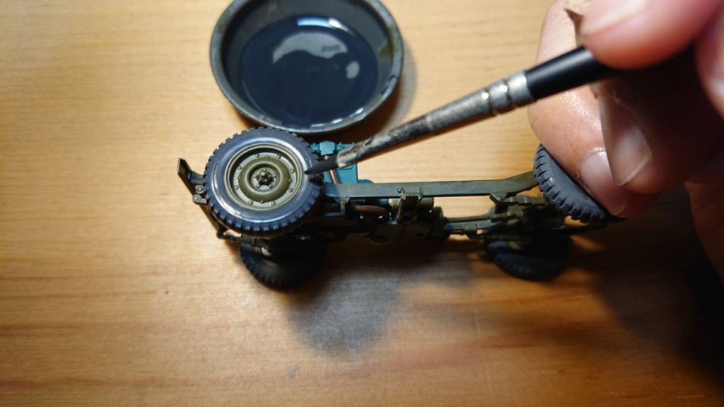 薄め液がまだ乾かないうちにタイヤブラックを薄めたものを塗ります。塗るというより流し込むイメージを持ちつつやっぱり塗る、みたいな感じですかね。下地のベースグレイがある程度透ける状態でやめておくと良いでしょう。