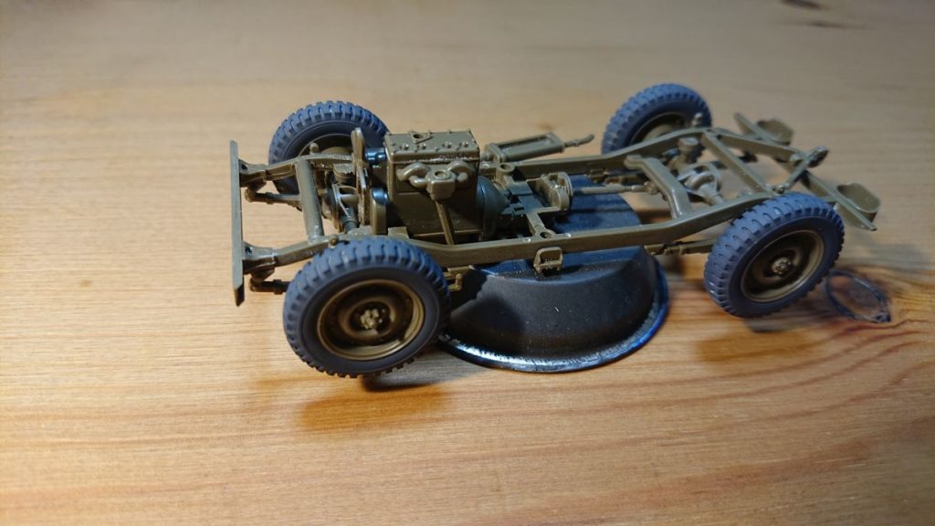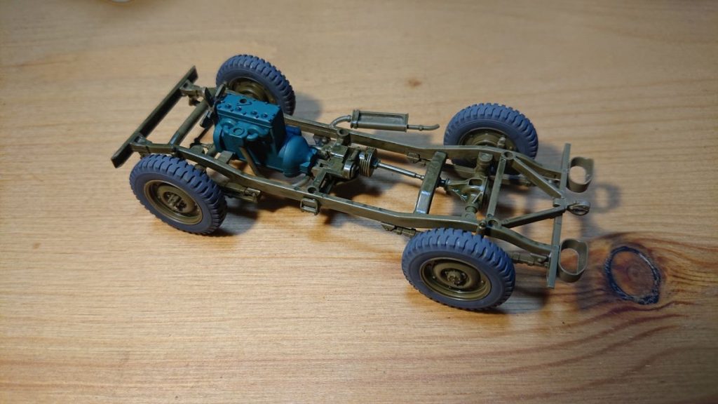 シャーシフレームも塗ってみました。エンジンブロックもフラットグリーンの指定だったので、ベースカラーのグリーンを塗ってみました。特にベースカラーに拘る必要はなかったのですが、初めて使う色だったので使ってみたかっただけという。オリーブドラブはまだ2回目なのでプラスチックの成型色がかなり透けて見えますが、更に塗り重ねるのでこれで大丈夫です。