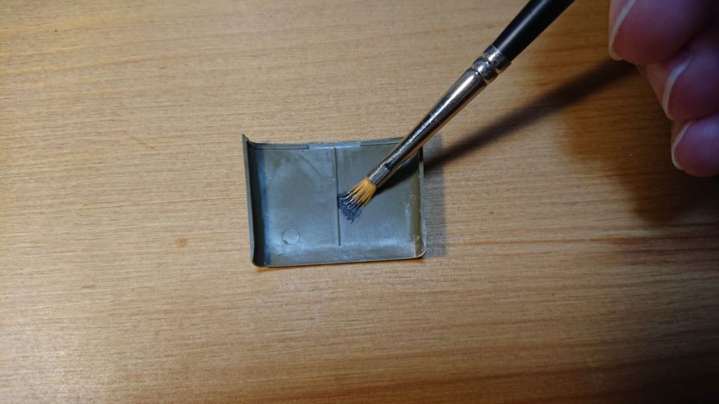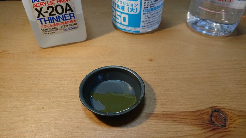 塗料は少しずつ出して都度薄めて使います。かき混ぜた棒に絡んだ塗料を塗料皿に移して、アクリジョン薄め液と水を1:1くらいで薄め、更に水性アクリル用の薄め液を1滴加えます。今回はアクリジョン薄め液1滴、水1滴、水性アクリル用薄め液1滴を加えました。かなり薄い感じになりますが、このくらい薄めると筆跡はかなり残りにくくなります。その一方で、アクリジョン薄め液と水だけだとプラスチック表面で弾かれるので、水性アクリル塗料を一滴加えるわけです。
