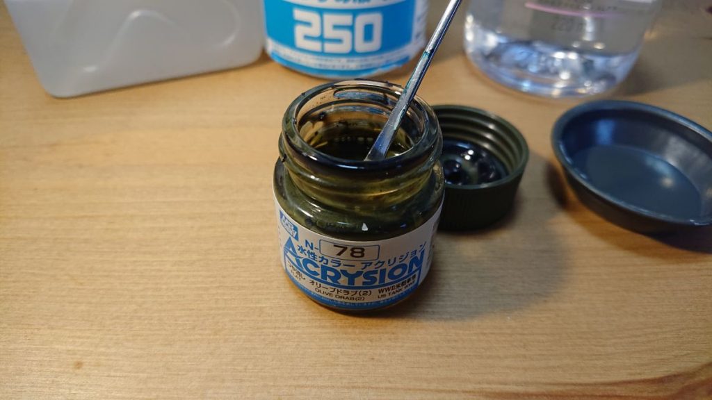 全体色はオリーブドラブの指定なので、オリーブドラブ(2)を使用します。オリーブドラブ(1)は米軍機などに使う色でやや茶色がかった色、オリーブドラブ(2)は米軍車両に使う色で(1)より緑が強めな色です。塗料は塗る前によく棒でかき混ぜます。棒で瓶底のヌルっとした感覚がなくなるまでかき混ぜるくらいよくかき混ぜましょう。
