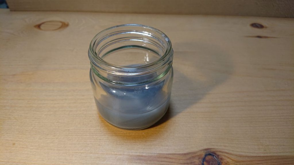 アクリジョンは乾燥前は水に溶けるので、筆を洗うためには皿ではなく空き瓶に水を入れて使用しました。乾燥前のアクリジョン塗料は、ツールクリーナーよりも水のほうが溶けやすいようなので、塗装後に筆を洗う場合はまず水で洗い、その後仕上げとしてツールクリーナーを使うようにしています。