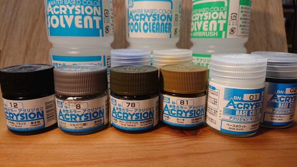 使用する塗料は、模型用として売られているものであれば何でも良いのですが、ここではGSIクレオスのアクリジョンを使用します。アクリジョンを使用する理由は